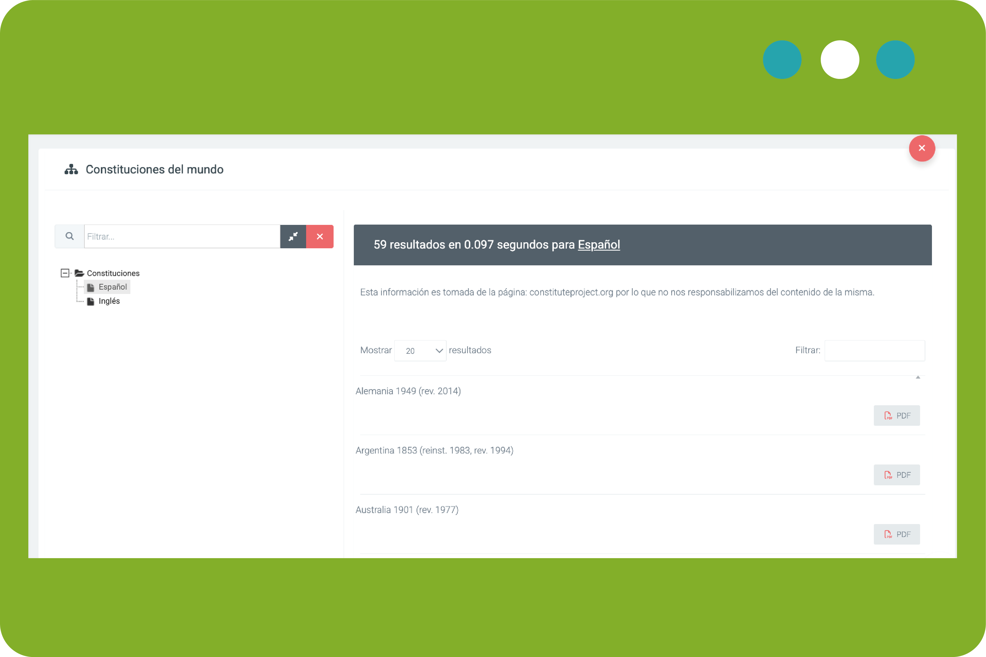 El sistema de consulta cuenta con las constituciones de otros países, estos son textos importantes para que el usuario pueda leer, analizar e investigar sobre el derecho constitucional extranjero.